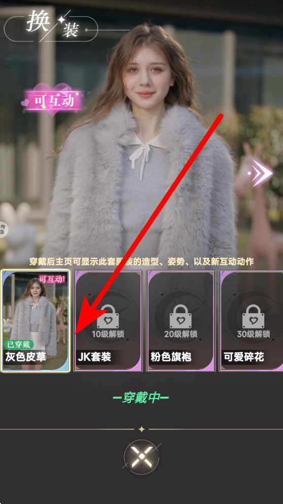 3、隨著等級(jí)提升,會(huì)解鎖不同的服裝套裝,在換裝界面,可選擇已解鎖的服裝為角色穿戴,更換造型,還能解鎖新的互動(dòng)動(dòng)作,豐富互動(dòng)體驗(yàn)。