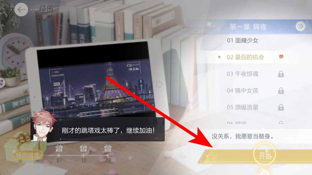 2、可看到不同章節(jié),比如第一章輝夜下有多個小節(jié),選好章節(jié)后點擊開始,就能進入對應(yīng)內(nèi)容,跟隨劇情感受演藝故事的發(fā)展。