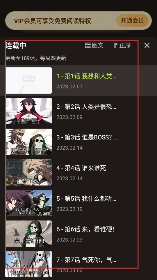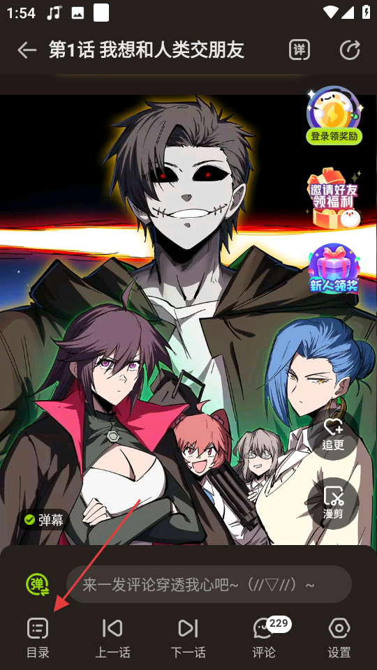 3、在菜單頁面,點擊左下角的目錄按鈕,彈出漫畫章節(jié)列表。