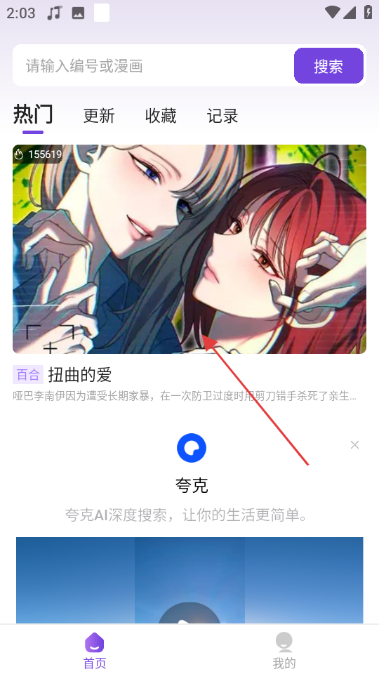 1、在首頁(yè)熱門漫畫中,點(diǎn)擊扭曲的愛(ài)漫畫封面,進(jìn)入該漫畫詳情頁(yè)。