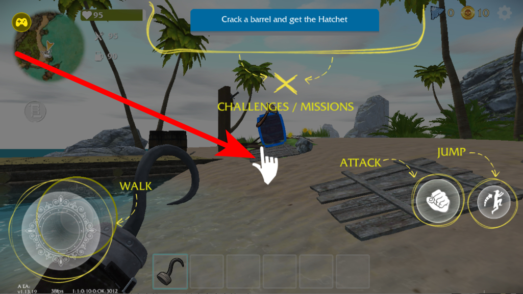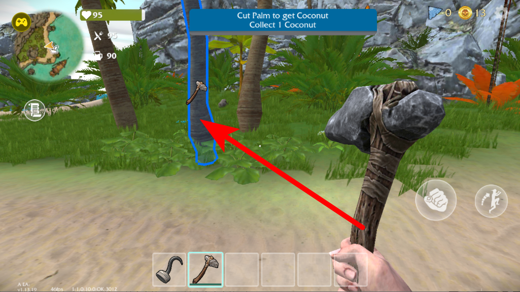 3、收集資源要在場(chǎng)景中尋找各類(lèi)可收集的物品,像通過(guò)破壞木桶獲取工具,砍伐棕櫚樹(shù)獲取椰子等,不斷積累資源,滿(mǎn)足生存需求。