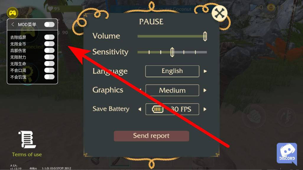 4、開(kāi)啟菜單作弊時(shí),進(jìn)入菜單界面,可找到作弊相關(guān)的設(shè)置,能獲取去除插屏、無(wú)限金幣、高額傷害等便利,助力更輕松地進(jìn)行生存冒險(xiǎn)。