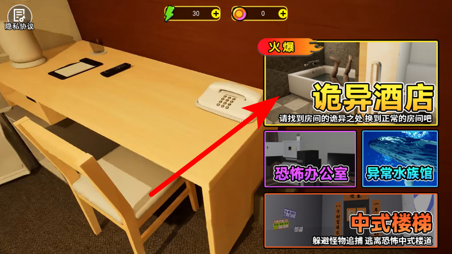2、選擇模式需在界面中挑選合適的模式,比如詭異酒店等模式,不同模式有著不同的場景與任務,開啟對應的探索體驗。