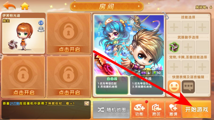 2、進(jìn)入房間需在游戲界面,找到并進(jìn)入房間,在房間中可進(jìn)行技能、武器副手等選擇,為接下來(lái)的競(jìng)技對(duì)戰(zhàn)做好準(zhǔn)備。