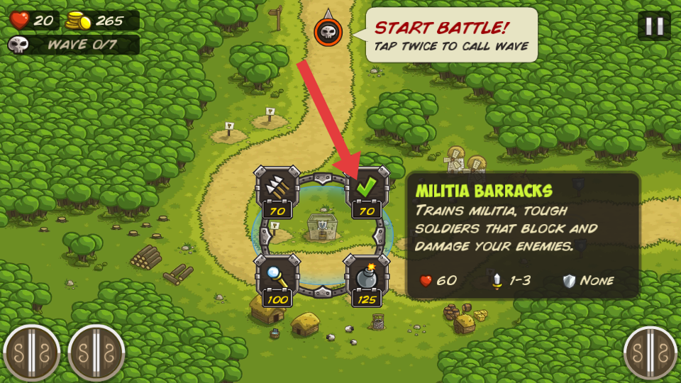 1、游戲開局,點(diǎn)擊箭頭指向的MILITIA BARRACKS民兵兵營,消耗70金幣建造該建筑,可訓(xùn)練民兵,能阻擋并傷害敵人。