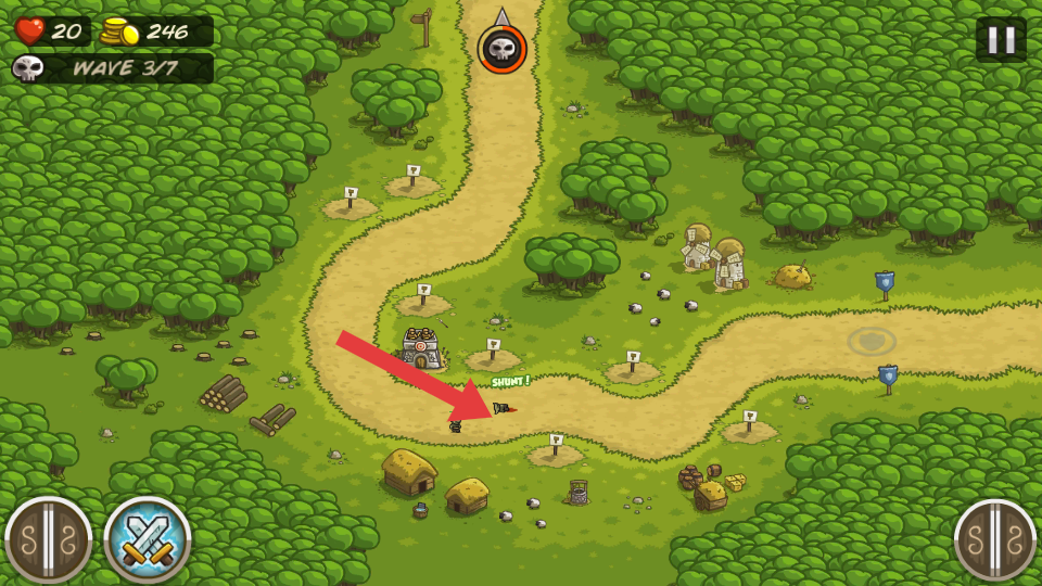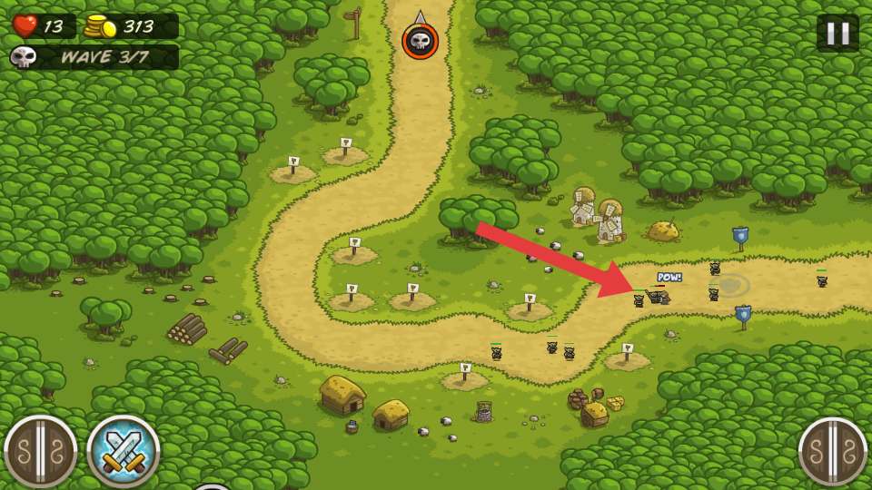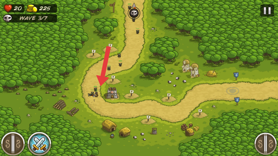 3、在箭頭指向的防御塔建造點(diǎn),可根據(jù)金幣數(shù)量和防御需求,選擇建造合適的防御塔,以加強(qiáng)該路段的防御,阻攔敵人前進(jìn)。