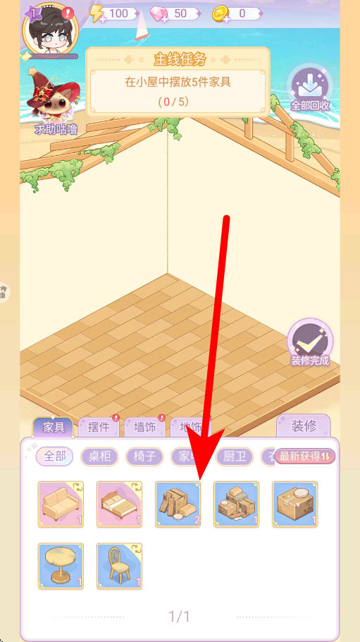 1、任務(wù)擺放家具時,任務(wù)指引下,從家具欄中挑選合適的家具,將其擺放到小屋內(nèi),逐步完成擺放指定數(shù)量家具的任務(wù),打造心儀的小屋布局。