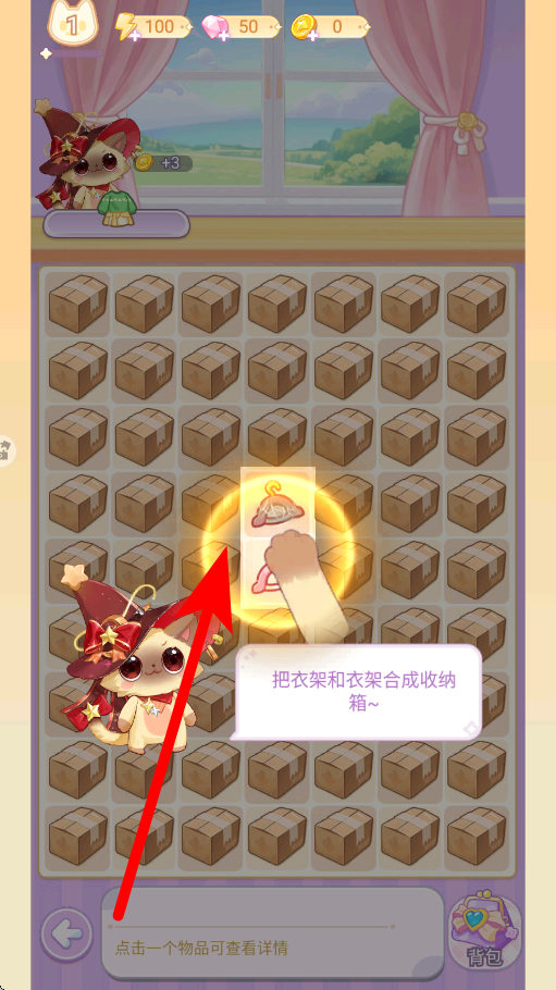 2、合成需在物品區(qū)域,將相同的物品,如衣架等,進(jìn)行合成操作,合成出收納箱等新物品,豐富物品的種類,為后續(xù)的經(jīng)營與裝扮提供更多素材。