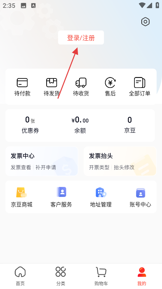 2、進入我的頁面后,點擊頂部的登錄注冊按鈕。