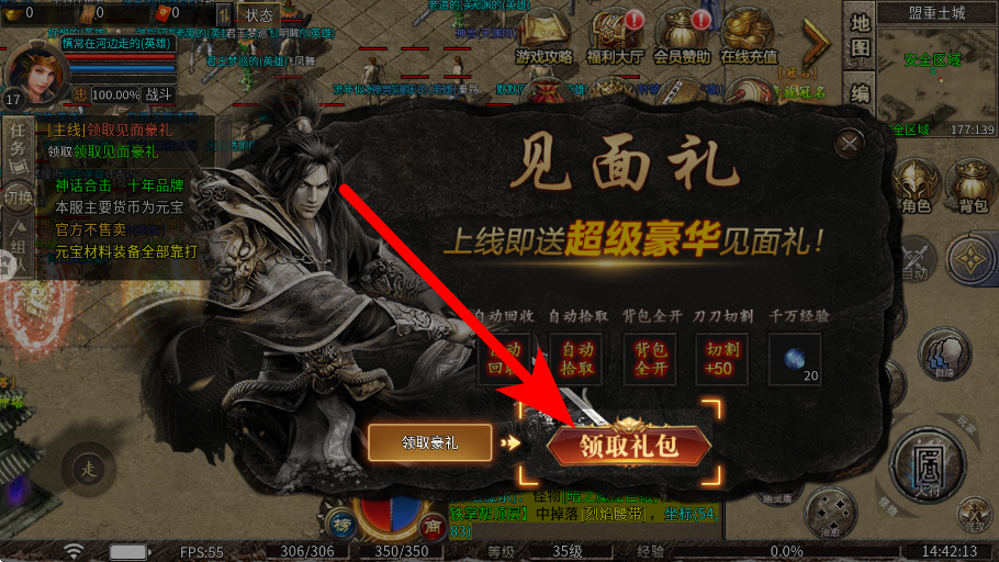 3、領(lǐng)取福利要在游戲中出現(xiàn)福利領(lǐng)取提示時,如見面禮等,點擊領(lǐng)取禮包,獲取上線即送的超級豪華見面禮,為后續(xù)的游玩提供助力。