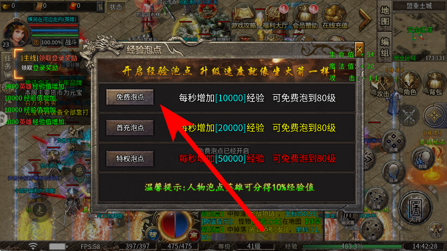4、泡點升級時,在經(jīng)驗泡點界面,選擇合適的泡點方式,如免費泡點,通過泡點來獲取經(jīng)驗,提升角色的等級,加快角色的成長速度活動。