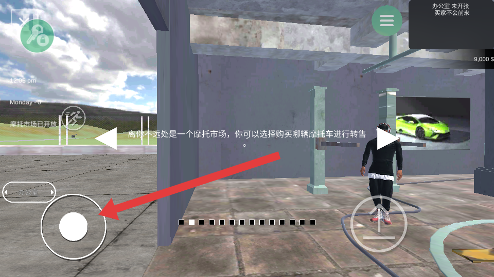 1、在場景中,操控箭頭指向的左側移動搖桿,可控制角色在場景內移動,通過調整搖桿方向,前往摩托市場等目標地點,角色移動基礎操作。