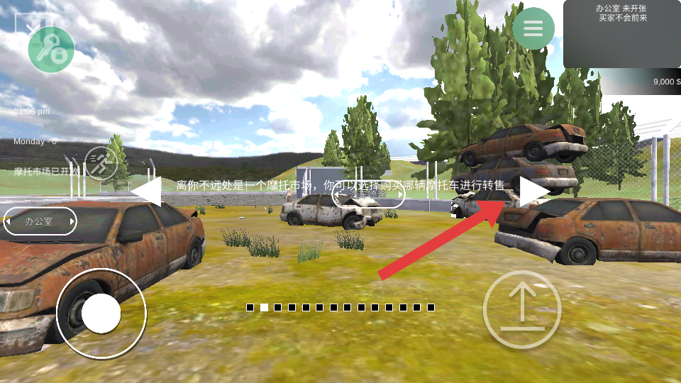 1、開局與基礎操作:點擊開始標識進入游戲,通過左側搖桿控制角色移動,箭頭按鈕實現跳躍,指定紅框標志切換視角,熟悉操作后開啟經銷商生涯。