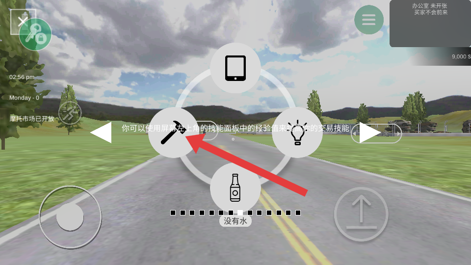4、點擊箭頭指向的扳手圖標,可使用技能面板中的經驗值來提升交易技能,增強在摩托車交易等方面的能力,助力游戲內的商業(yè)活動。