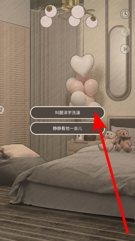 1、主線選擇出現(xiàn)分支時(shí),比如有叫醒澤宇洗澡、靜靜看他一會(huì)兒等選項(xiàng),根據(jù)自己的想法點(diǎn)擊對(duì)應(yīng)選項(xiàng),就能決定劇情的走向。
