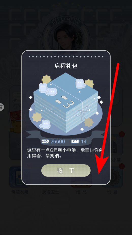 3、當(dāng)出現(xiàn)福利禮包,像啟程禮包時(shí),點(diǎn)擊收下按鈕,就能獲取禮包內(nèi)的G元、小電池等資源,這些資源后續(xù)能派上用場。
