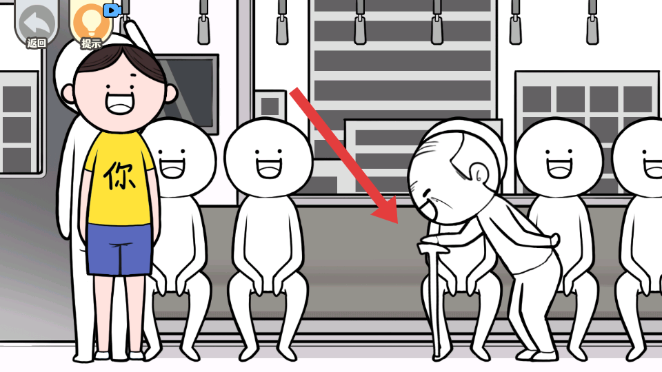 1、在地鐵場景中,看到箭頭指向的需要幫助的老人時(shí),可進(jìn)行互動(dòng),比如主動(dòng)讓座,完成善意行為相關(guān)的游戲任務(wù)。