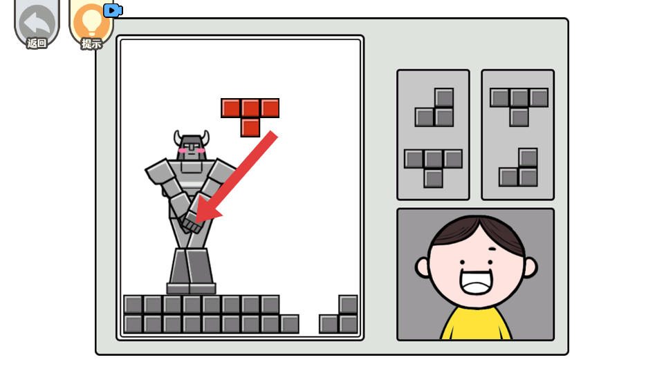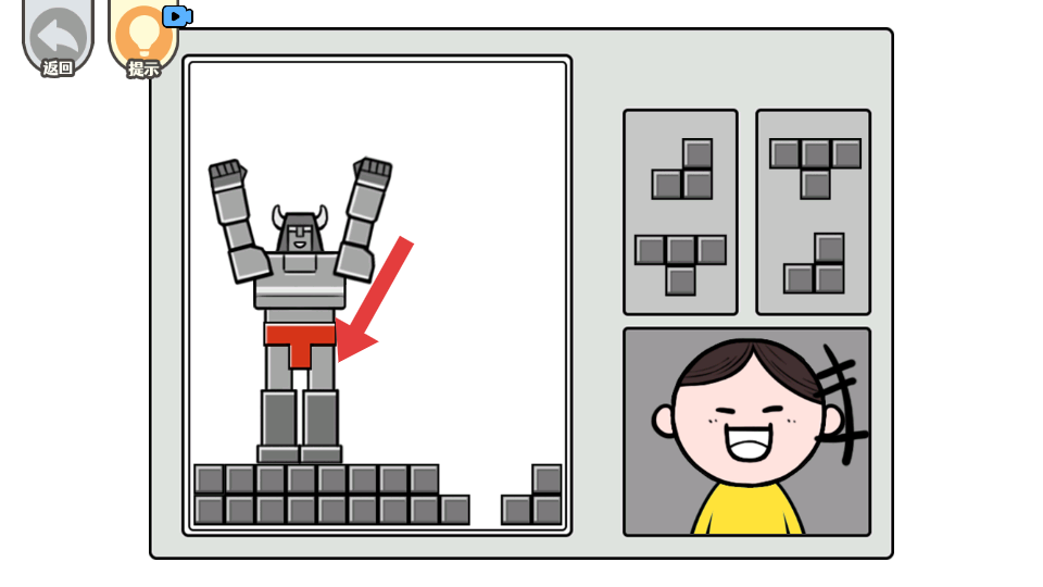 2、在機(jī)器人拼圖關(guān)卡,按照箭頭指示,將紅色方塊放置到機(jī)器人對應(yīng)的部位,逐步完成機(jī)器人的組裝,推進(jìn)解謎進(jìn)程。