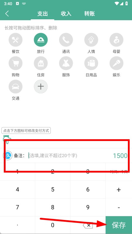 3. 輸入支出金額,根據(jù)需要填寫備注信息,然后點(diǎn)擊保存按鈕。