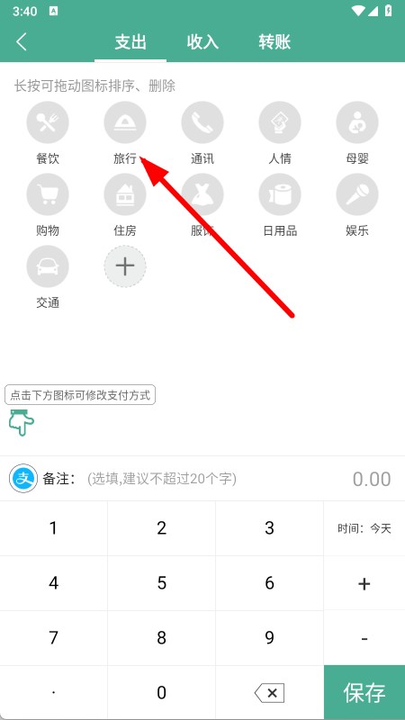 2. 在支出分類選擇頁(yè)面,點(diǎn)擊旅行分類圖標(biāo),進(jìn)入旅行支出記錄頁(yè)面。