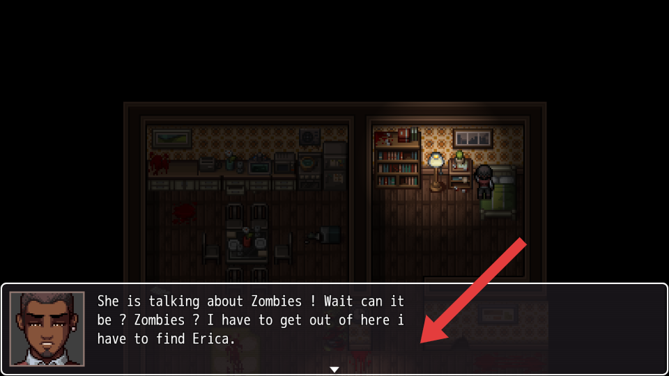 3、當(dāng)出現(xiàn)劇情對(duì)話時(shí),關(guān)注箭頭指向的提示內(nèi)容,了解游戲背景如僵尸出現(xiàn)、尋找Erica,明確后續(xù)行動(dòng)目標(biāo)。