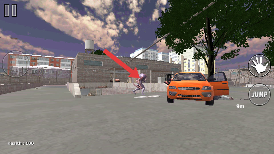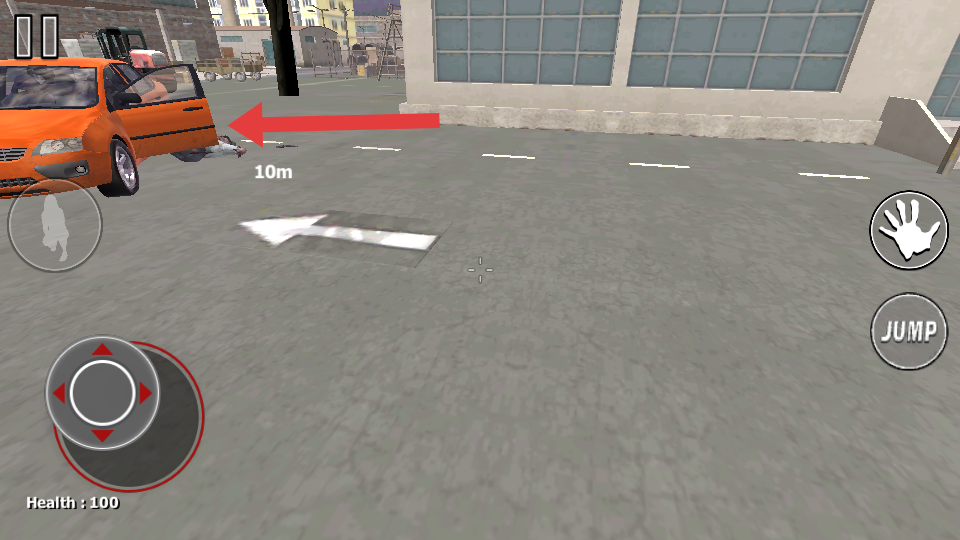 3、沿著箭頭指向的橙色車輛方向移動,該車輛可作為臨時掩體,躲避喪尸追擊,也可在附近搜索物資,提升生存能力。