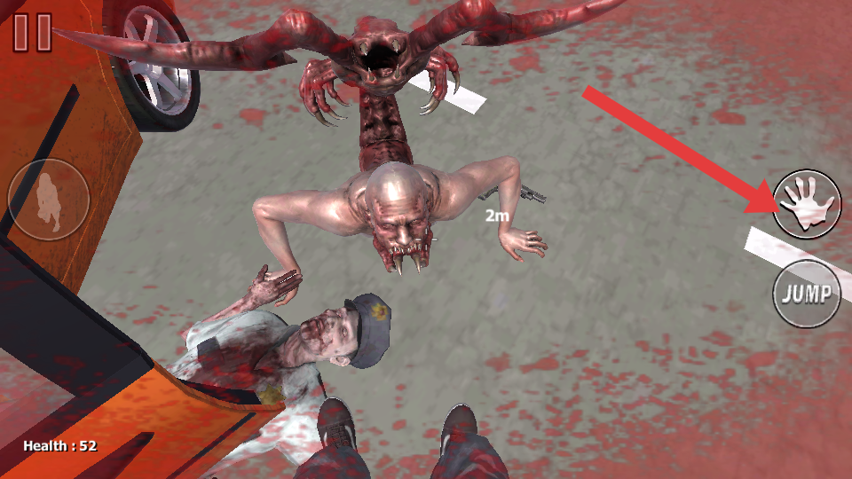 2、當被多個喪尸圍攻時,注意觀察喪尸的攻擊節(jié)奏,點擊箭頭指向的交互按鍵手掌圖標,可嘗試觸發(fā)近戰(zhàn)攻擊或與周圍物體互動。