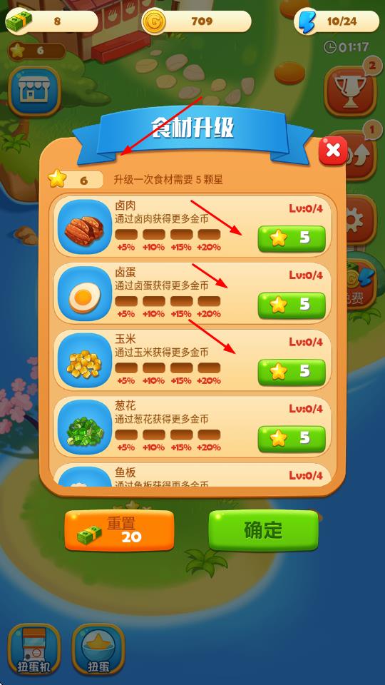 1、進入食材升級界面,消耗5顆星可升級鹵肉、鹵蛋等食材,升級后能通過對應(yīng)食材獲得更多金幣,助力資源積累。