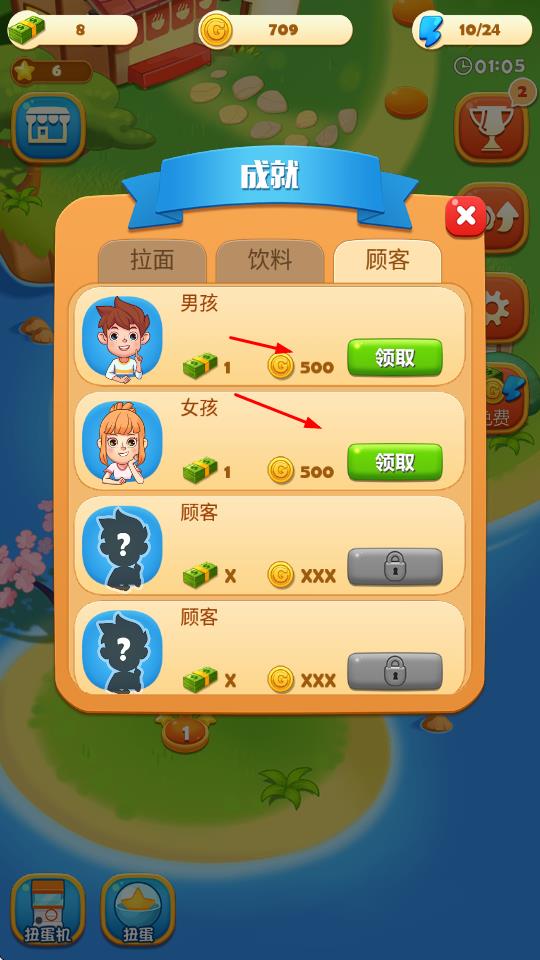 2、在成就界面,完成男孩、女孩等顧客相關(guān)成就后,點擊領(lǐng)取按鈕,獲取金幣等獎勵,提升游戲進度。