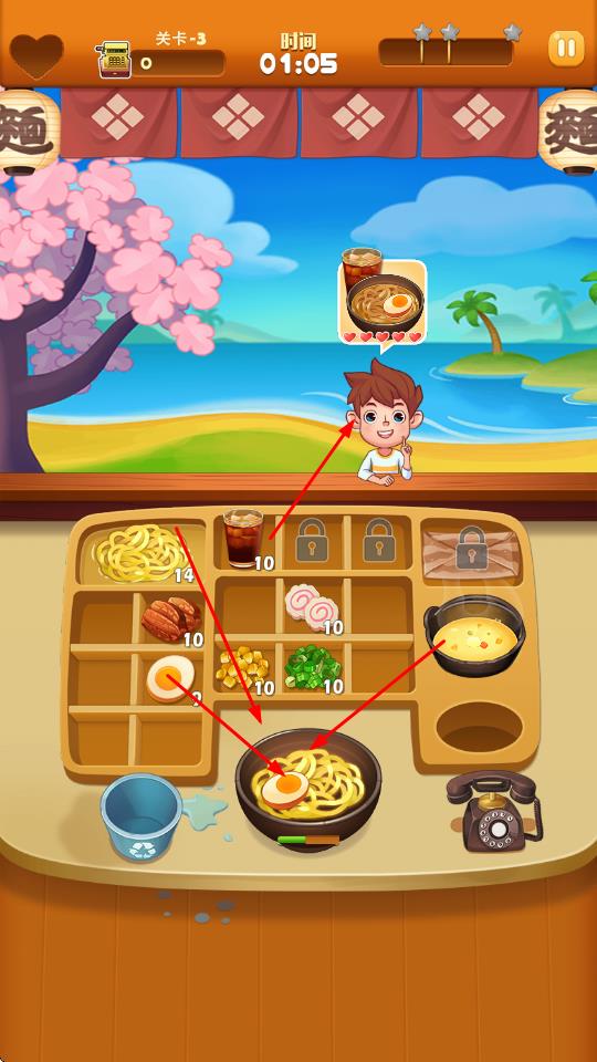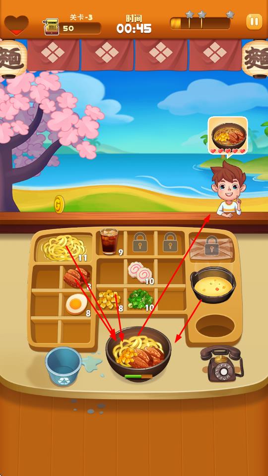 3、在關(guān)卡中,根據(jù)顧客頭頂顯示的拉面需求,從食材區(qū)選取對應(yīng)食材放入碗中,制作符合要求的拉面。