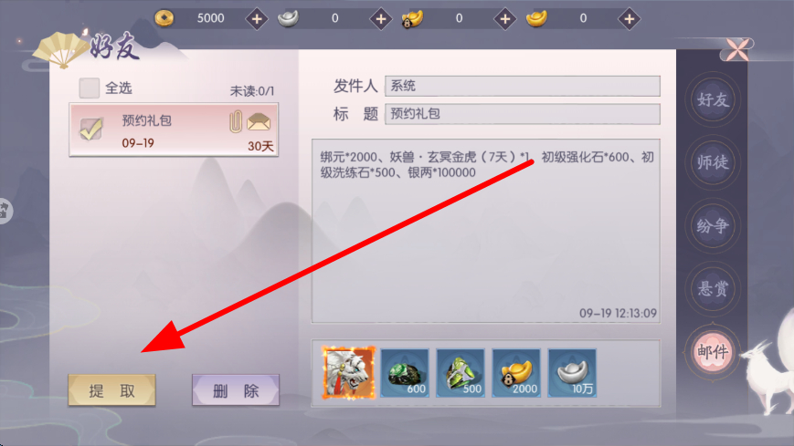 4、郵件界面,若有系統(tǒng)發(fā)送的預(yù)約禮包等獎(jiǎng)勵(lì),點(diǎn)擊提取按鈕,就能獲取禮包內(nèi)的綁元、妖獸以及各類強(qiáng)化材料等,助力角色成長(zhǎng)。