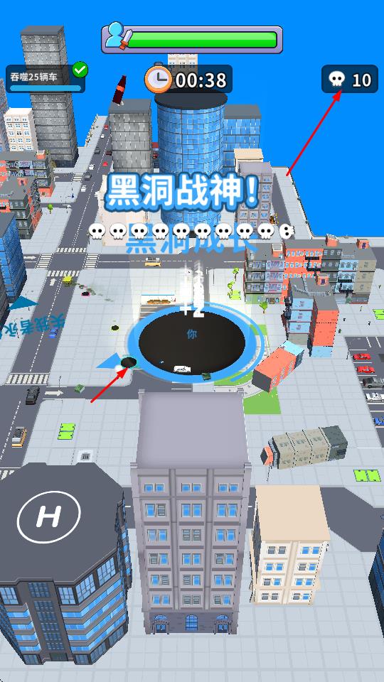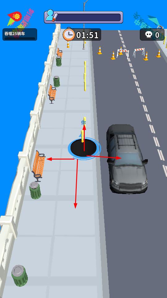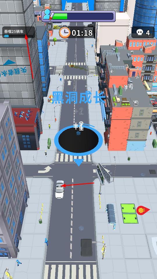 3、在游戲時(shí)間限制內(nèi),朝著吞噬25輛車等目標(biāo)努力,合理規(guī)劃黑洞移動(dòng)路徑,提升吞噬效率,推動(dòng)黑洞成長。