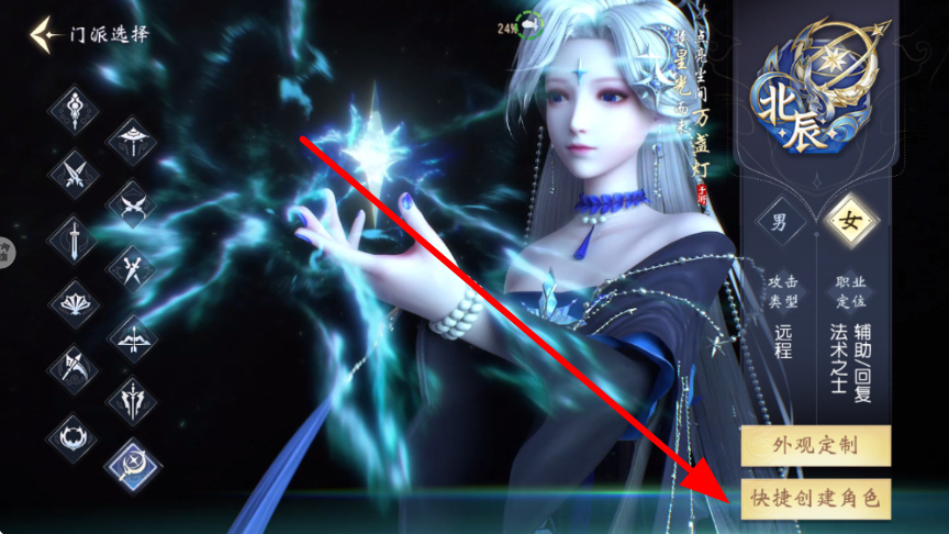 1、新手可選擇不同門派,像北辰這類法術(shù)、兼具輔助與回復(fù)能力的門派,選好門派后,點(diǎn)擊創(chuàng)建角色,開啟武俠冒險之旅。