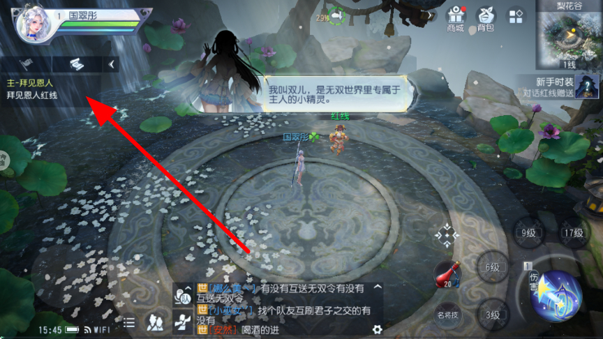 2、進(jìn)入游戲后,會有主線任務(wù)指引,拜見恩人紅線等任務(wù),推進(jìn)主線任務(wù)進(jìn)程,在完成任務(wù)過程中了解武俠世界的故事,提升角色實力。