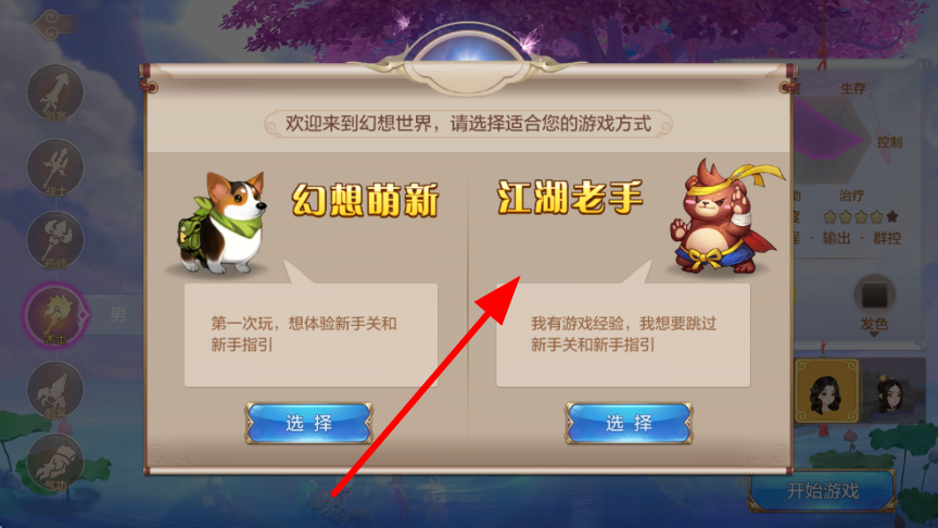 2、進(jìn)入游戲后,可選擇適合自己的游戲方式,若是第一次玩,可選擇幻想萌新,體驗(yàn)新手關(guān)和新手指引,若有經(jīng)驗(yàn),可選擇江湖老手,跳過新手關(guān)和指引。