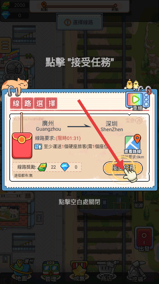 1、在路線選擇界面,點擊接受任務,接取從廣州到深圳的運輸任務,需在限時內(nèi)運送至少1個硬座旅客。