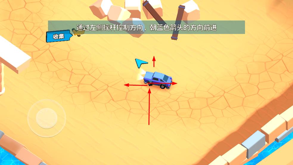 1、通過左側(cè)搖桿控制車輛方向,朝著藍色箭頭指引的方向前進,這是探索場景的基礎(chǔ)操作,開啟游戲之旅。