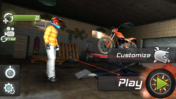 1、進入游戲,會處于車庫場景,可先熟悉角色與摩托車,為后續(xù)摩托特技挑戰(zhàn)做準備,然后點擊Play按鈕進入游戲。
