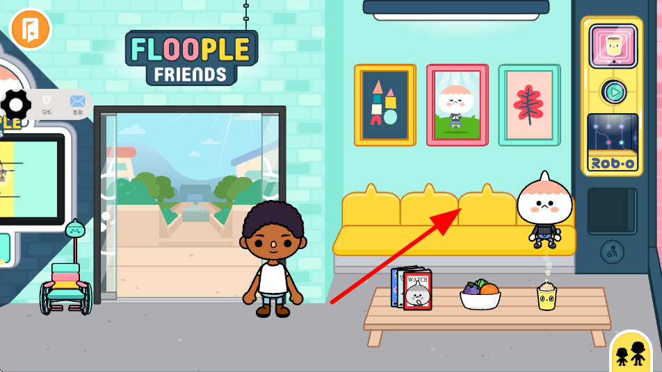 3、進(jìn)入小鎮(zhèn)場景后,可以手機(jī)點(diǎn)擊滑動操控角色在不同區(qū)域活動,比如來到擺放著黃色沙發(fā)等家具的室內(nèi)區(qū)域,感受小鎮(zhèn)的生活氛圍。