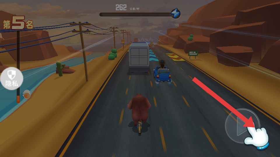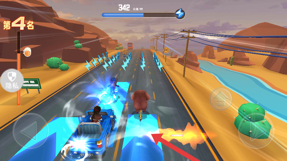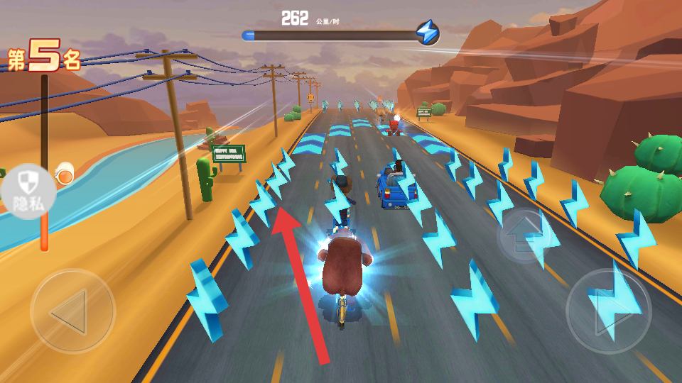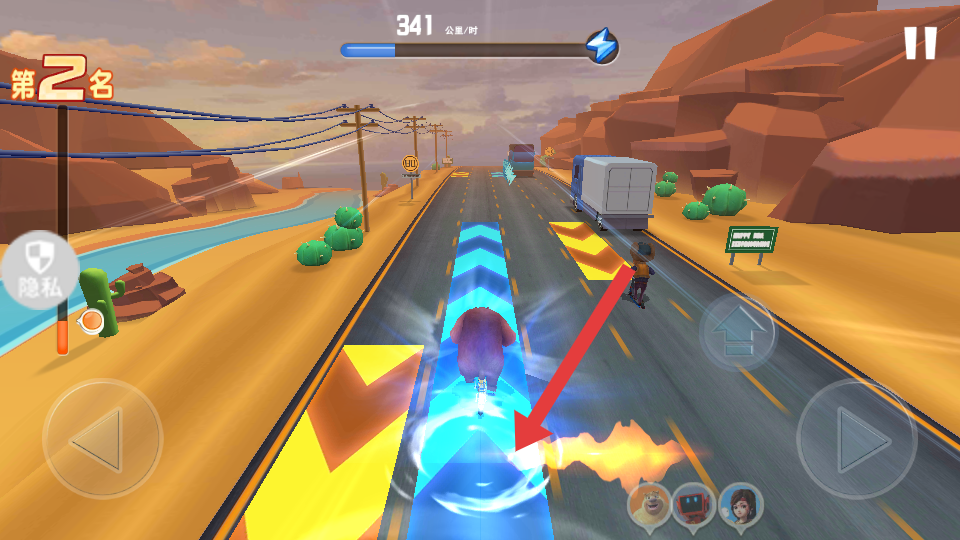 2、行駛過程中,駛?cè)胨{(lán)色閃電區(qū)域,獲取加速效果,提升行駛速度,拉開與其他選手的距離。