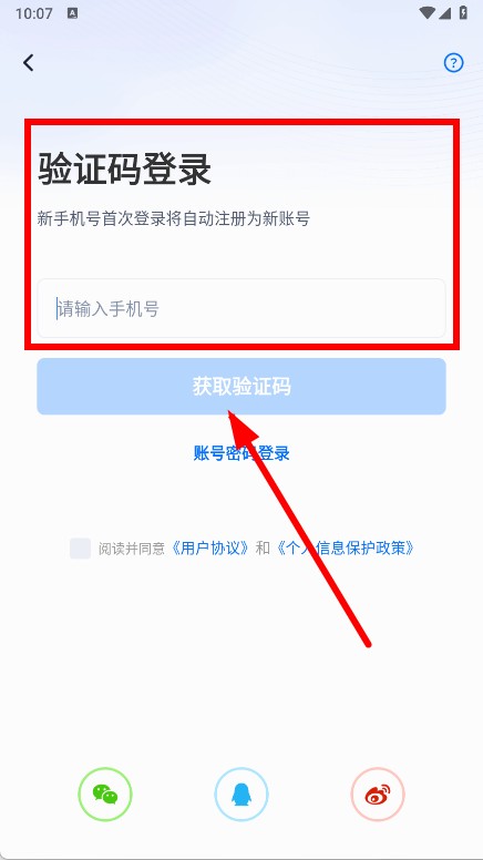 3、在驗證碼登錄頁面輸入手機號,點擊獲取驗證碼。