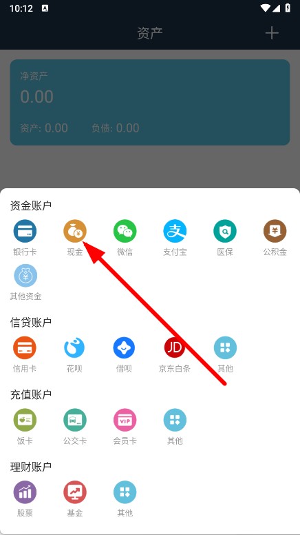 3、在資產(chǎn)類型選擇框中選擇現(xiàn)金,進入添加資產(chǎn)頁面。