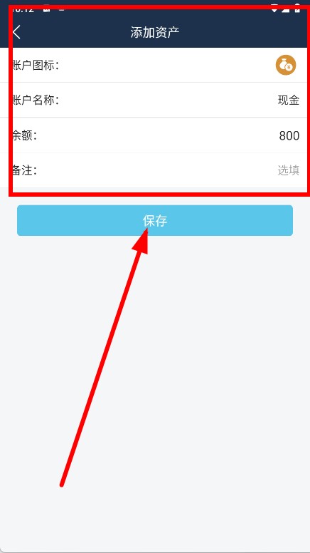 4、在添加資產(chǎn)頁面填寫賬戶名稱、余額等信息后點擊保存,完成資產(chǎn)添加。