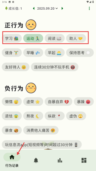 1、在首頁行為記錄中可以查看學習、運動、閱讀、助人等行為。