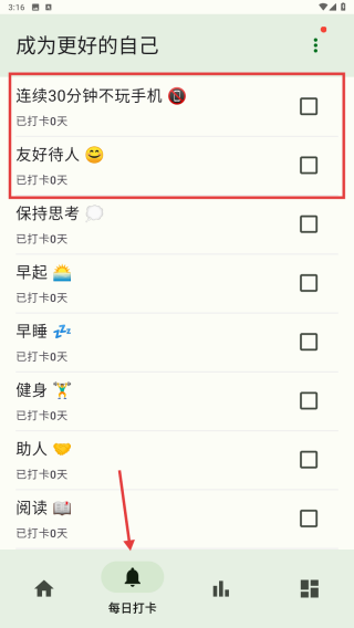 2、在每日打卡功能當中可以查看連續(xù)30分鐘不玩手機和友好待人。