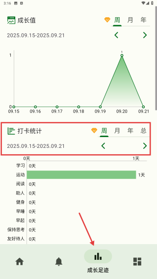 3、在成長記錄中查看打卡的記錄情況峰值。