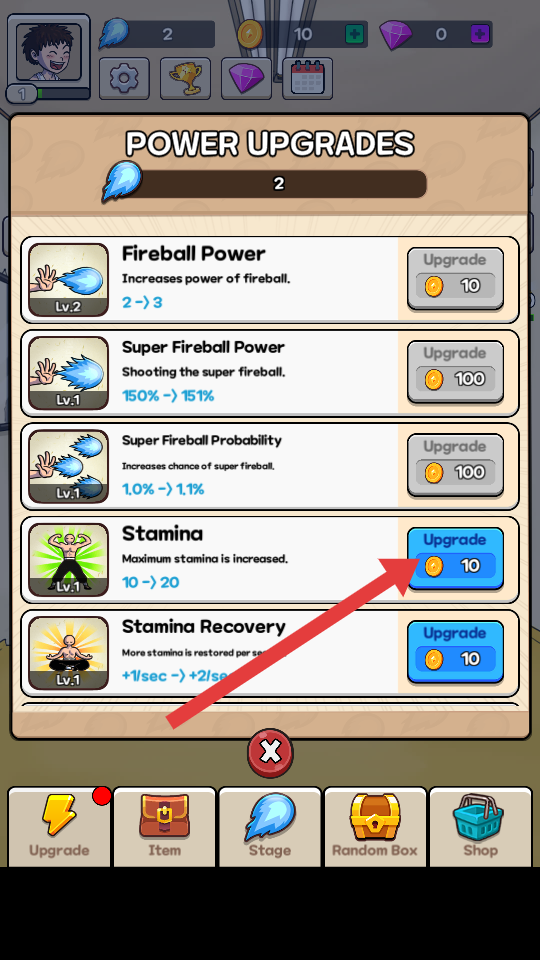 2、進入POWER UPGRADES升級界面后,花費10金幣可將最大耐力從10提升至20,提升角色的持續(xù)的戰(zhàn)斗的能力。