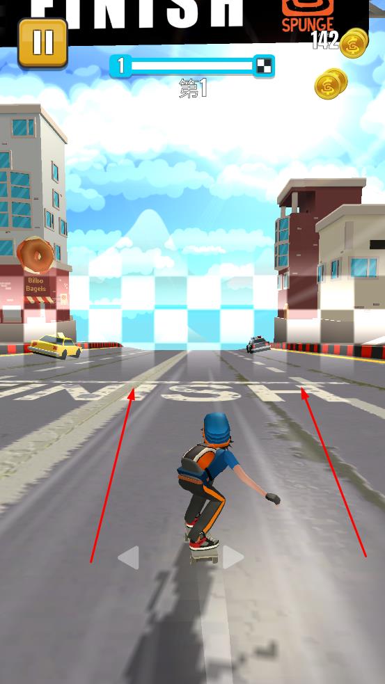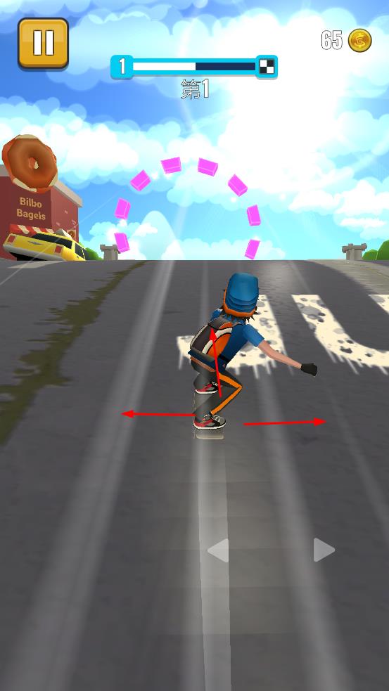 1、點(diǎn)擊開始游戲,操控滑板角色在道路上左右移動(dòng),靈活躲避障礙,朝著目標(biāo)方向前進(jìn)。