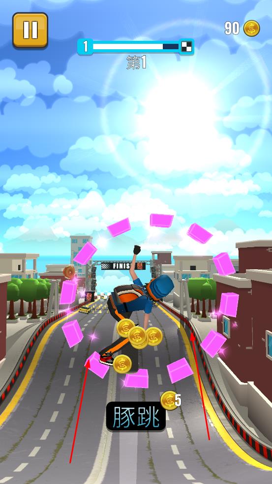 2、行駛過程中,可觸發(fā)豚跳等動(dòng)作,收集粉色道具與金幣,積累資源的同時(shí)提升游戲表現(xiàn)。
