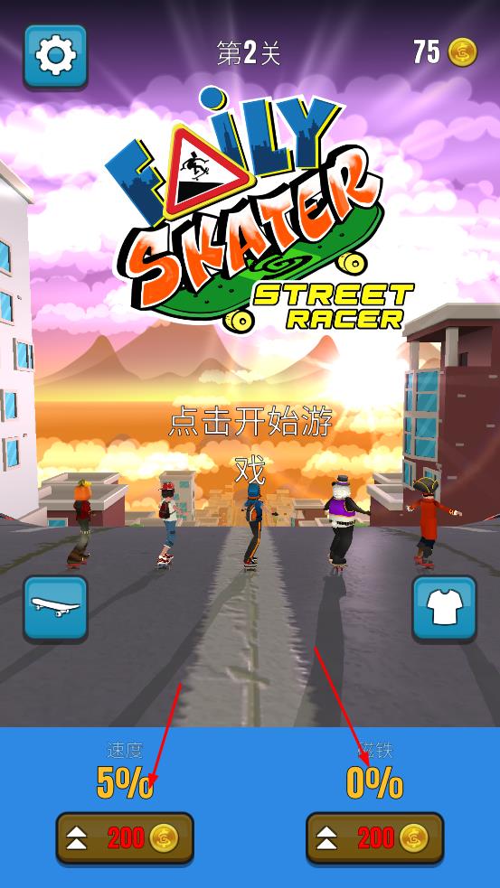 4、在關(guān)卡選擇界面,可消耗金幣升級(jí)速度等屬性,優(yōu)化滑板性能,為后續(xù)競速提供助力。